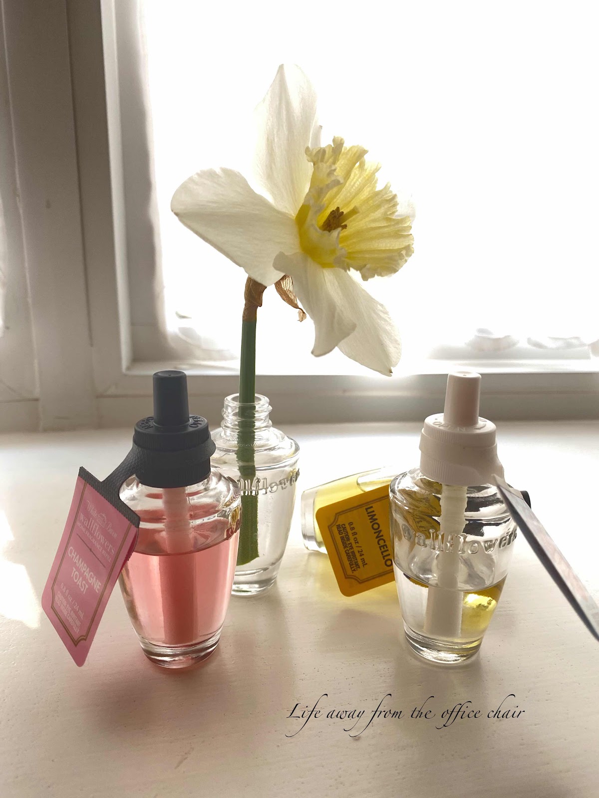 We are always buying air fresheners for our Wallflower plugins by Bath & Body works. I had a few of the empty glass fragrance bottles hanging around in the cabinet so I could remember the fragrances I liked best.